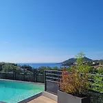 The property offers a balcony and a dressing room with views of the pool and comforts like air conditioning. For added convenience, a walk-in shower and a separate toilet are available at Architect-designed villa, overlooking Agay Bay. Hair dryers and towels are also included in the bathroom.